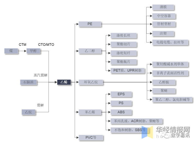 乙烯生產工藝流程可分為三類:煤制烯烴(CTO/MTO)、石腦油蒸汽裂解、乙烷裂解。乙烯下游產品包括聚乙烯(PE)、乙二醇、環(huán)氧乙烯、苯乙烯、聚氯乙烯(PVC)等,這些衍生物的主要下游產品有塑料、纖維、橡膠等合成材料以及表面活性劑、黏合劑、涂料等,終應用于包裝、農業(yè)、建筑、電子電器、機械和汽車等行業(yè)。