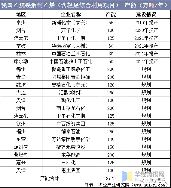 與傳統(tǒng)石腦油裂解路線相比,乙烷裂解具有工藝流程短、裝置投資少、乙烯收率高等優(yōu)勢。特別是在我國煉油產能過剩,乙烯供應不足的現實情況下,依托進口乙烷資源發(fā)展乙烯產業(yè),是解決煉油和化工結構性矛盾的新思路。據統(tǒng)計,目前國內乙烷裂解制乙烯(包括混合烷烴為原料)項目約20個,產能合計約2775萬噸/年。