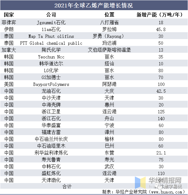 據統(tǒng)計,2021年全球新增乙烯產能達1385.4萬噸/年,新增乙烯產能的67%來自中國;韓國一批乙烯裝置集中投產,新增乙烯產能近200萬噸/年。2021年全球乙烯產能增長情況。
