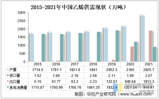 2014-2018年隨著供給側改革推進、化工行業(yè)去產能等因素的影響,我國乙烯產量的增速較慢。截至2019年去產能基本完成,隨著民營煉化一體化項目的集中上馬,我國進入新一輪擴產周期,乙烯產量突破2000萬噸,同比增長率高達11.48%。近年來,我國乙烯進口量具有一定波動性,截至2021年,乙烯實現進口數量2.07億噸,同比增長4.55%;2015年以來,我國乙烯出口數量呈震蕩上行走勢,2021年,國內乙烯出口數量達1913.3萬噸,同比增長103.4%。2015-20