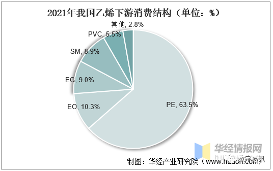我國乙烯工業(yè)已逐步進入成熟期,下游衍生物主要有PE、環(huán)氧乙烷(EO)、EG、SM、聚氯乙烯(PVC)等產品。五類產品共占乙烯總消費量約97.2%。其中,最大消費領域是PE,占總消費量的63.5%。其次是EO和EG,分別占10.3%和9.0%。