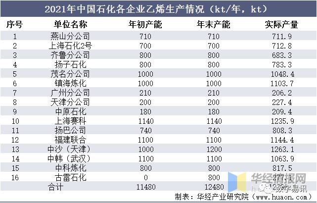 2021年中國石化各企業(yè)乙烯生產情況(kt/年,kt)