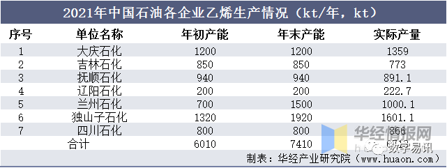 2021年中國石油各企業(yè)乙烯生產情況(kt/年,kt)