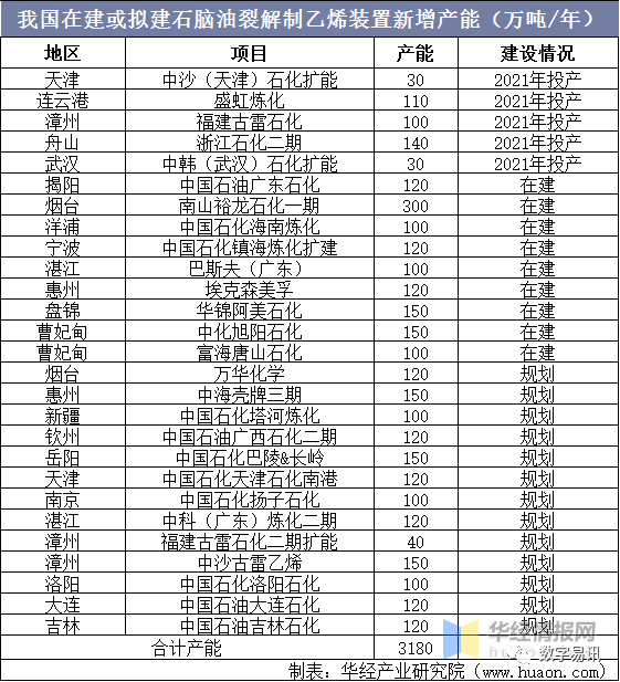 在乙烯盈利能力普遍穩(wěn)健、供需缺口較大的情況下,新建煉化一體化項目均配套大乙烯項目。隨著一批煉化項目配套乙烯裝置投產,加之部分擴能改造項目,預計2021–2024年,我國將新增石腦油裂解乙烯產能約1670萬噸/年,另有規(guī)劃中的乙烯產能約1510萬噸/年,合計新增產能約3180萬噸/年。
