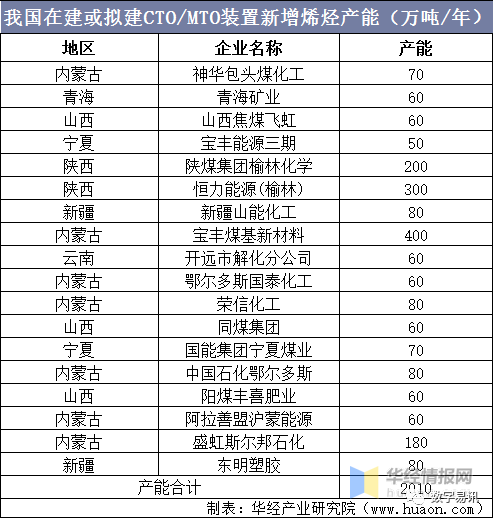 我國在建或擬建CTO/MTO裝置新增烯烴產能(萬噸/年)