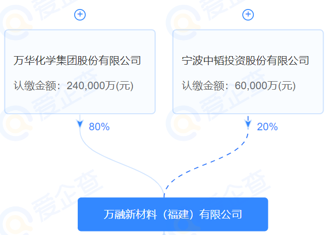 從愛企查官網所知,萬融新材料(福建)有限公司屬于萬華化學控股子公司,注冊時間為2021年3月31日,注冊資金30億元,注冊地址位于福建省福州市福清市江陰工業(yè)集中區(qū),萬華化學、寧波中韜兩家企業(yè)控股,其中萬華化學占股80%。