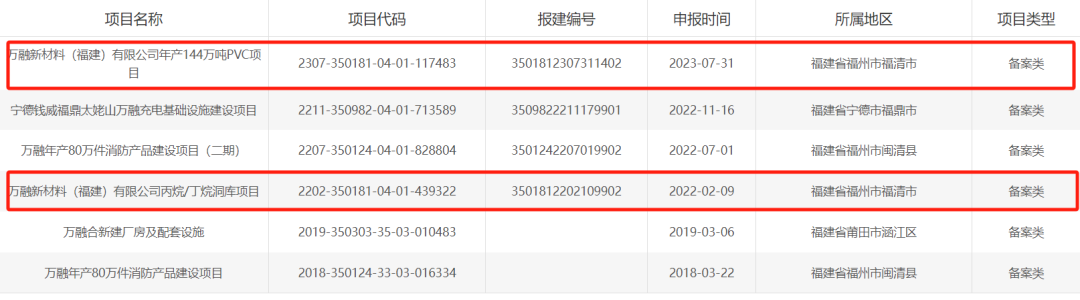 另外,從福建省投資項目在線審批監(jiān)管平臺得知,萬融新材料還有“年產144萬噸PVC項目”、“丙烷/丁烷洞庫項目”這兩個項目分別于2023年7月31日、2022年2月9日進行了項目備案。